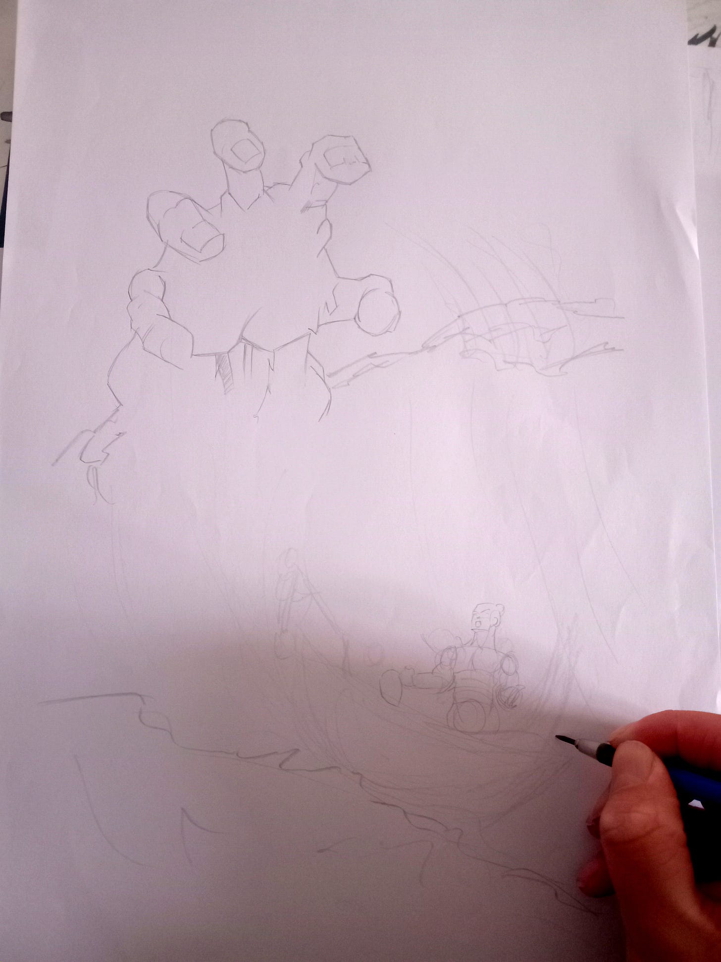 Once I like a thumbnail, I do the full size sketch. Keep it quick, keep it loose. This will maintain the energy in a peice, and I then look for ways to improve it before final pencils.